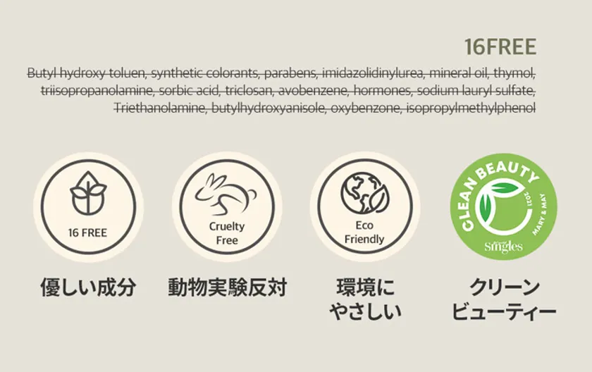 MARY&MAYは単純でやさしい成分を正直に配合するクリーンビューティーを志向するブランドです。全成分EWGグリーンレベル、動物テスト禁止、16種類の有害成分など肌にトラブルを起こす原料は徹底的に排除するのはもちろん、その中でも皮膚改善効果が確実な成分は十分な量を配合し即効能を高め、最高の原料と技術を組み合わせシナジー効果を高めました。
