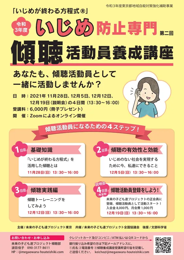 未来の子ども達プロジェクト(東京都豊島区、代表:入山 久美)は、いじめ防止専門傾聴活動員養成講座の第二回を、2021年11月28日、12月5日、12月12日、12月19日にオンラインにて開催します。