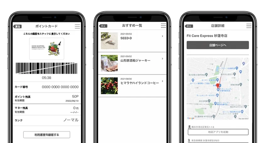 図2 ポイントカード・おすすめ一覧・店舗詳細画面ショット