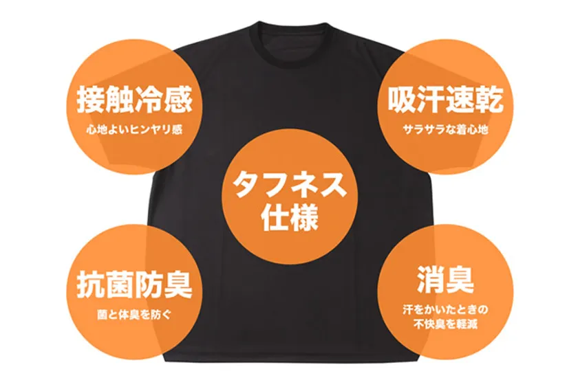 タフネス仕様、接触冷感、吸汗速乾、抗菌防臭、消臭(消臭テープ)