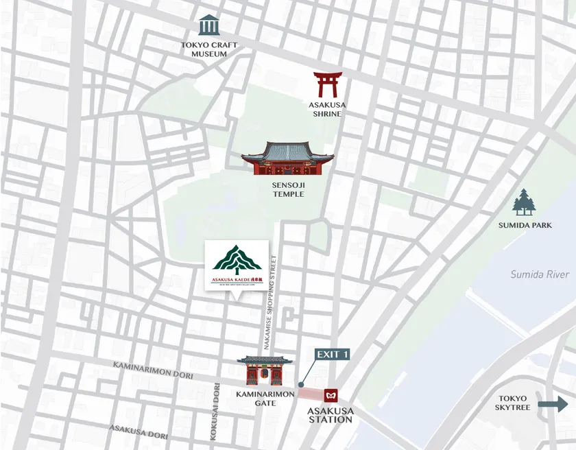 浅草楓は仲見世通りの静かな脇道に位置し、浅草寺や雷門から歩いてすぐの場所にあります