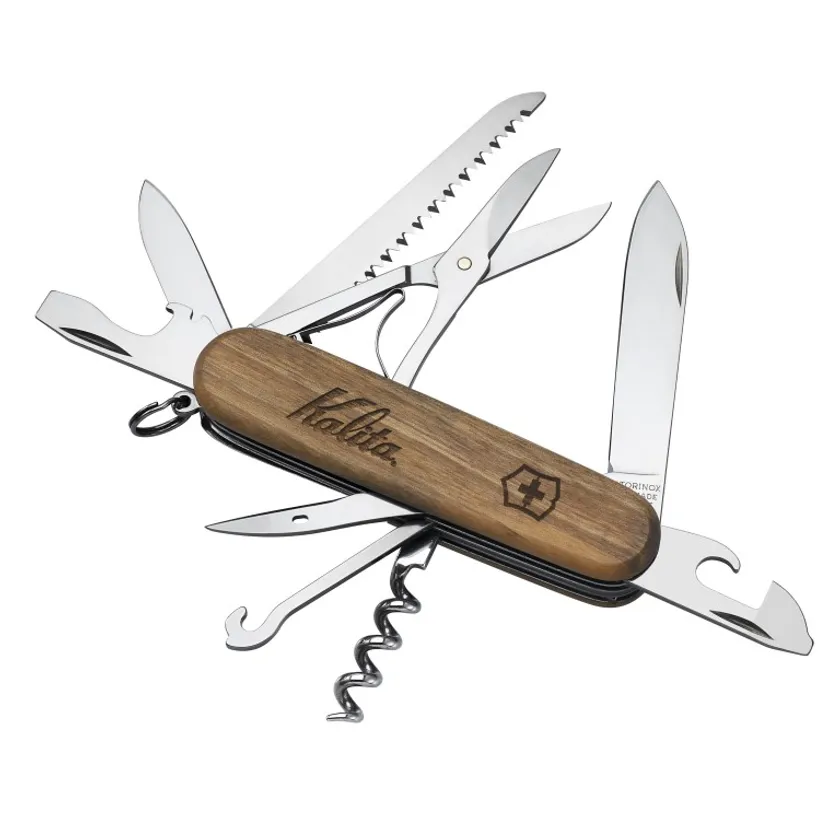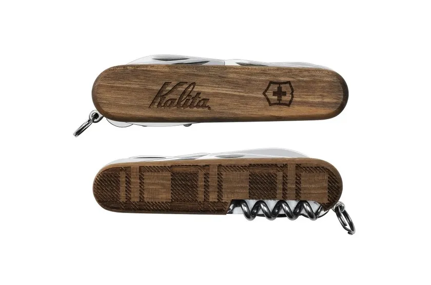 今回の特別な『ハントマン・ウッド Kalita』は、日本でのライフスタイルを楽しみ、スタイリッシュで小さなお供を毎日ポケットに入れて持ち歩きたい人にとって理想的なパートナーです。象徴的な存在である『ハントマン・ウッド Kalita』は、その豊かな木目と温かみのあるウォールナット材のハンドルと、備わったドライバーやコルクせん抜き、ワイヤーストリッパーやハサミなど、さまざまな実用的な機能が評価されています。さらに、カリタのロゴが木製の目盛りに刻印されており、ビクトリノックスの象徴である「クロス&シールド」と並んで、存在感を放っています。
