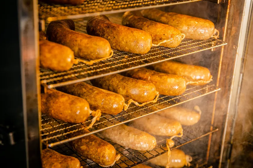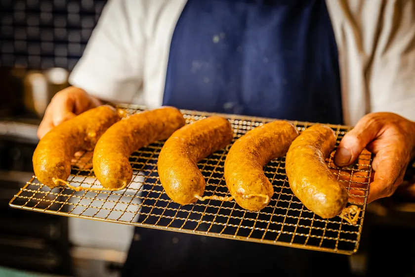 この豚腸に、丁寧に手ごねした挽肉を腸詰めし、乾燥をかけて皮目の水分をしっかりと抜き、最後にサクラチップでスモークをかけます。