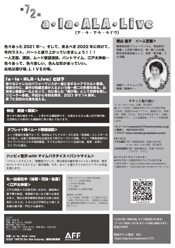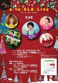 第72回「a・la・ALA・Live」が2021年12月20日(月)に内幸町ホール(東京都千代田区)にて開催されます。チケットはカンフェティ(運営:ロングランプランニング株式会社、東京都新宿区、代表取締役:榑松 ⼤剛)にて発売中です。