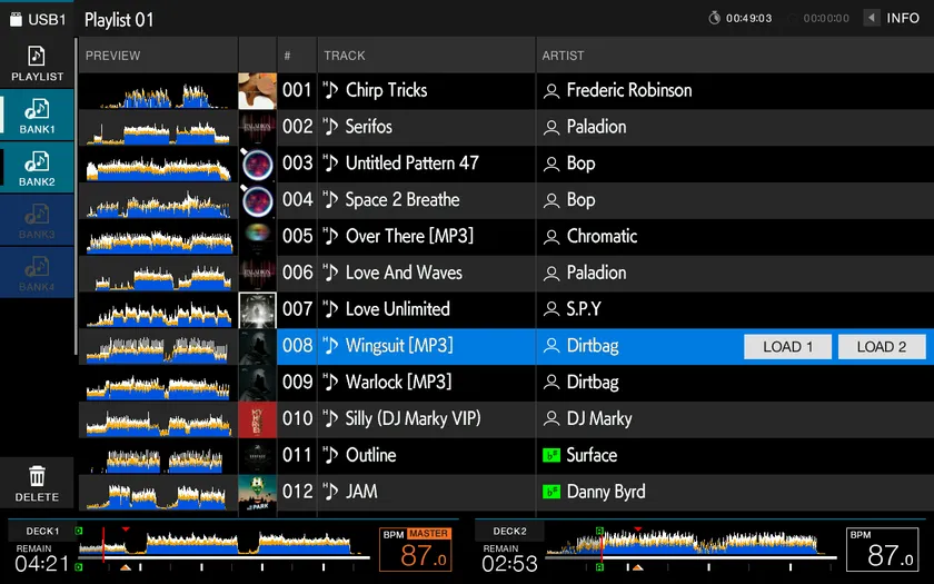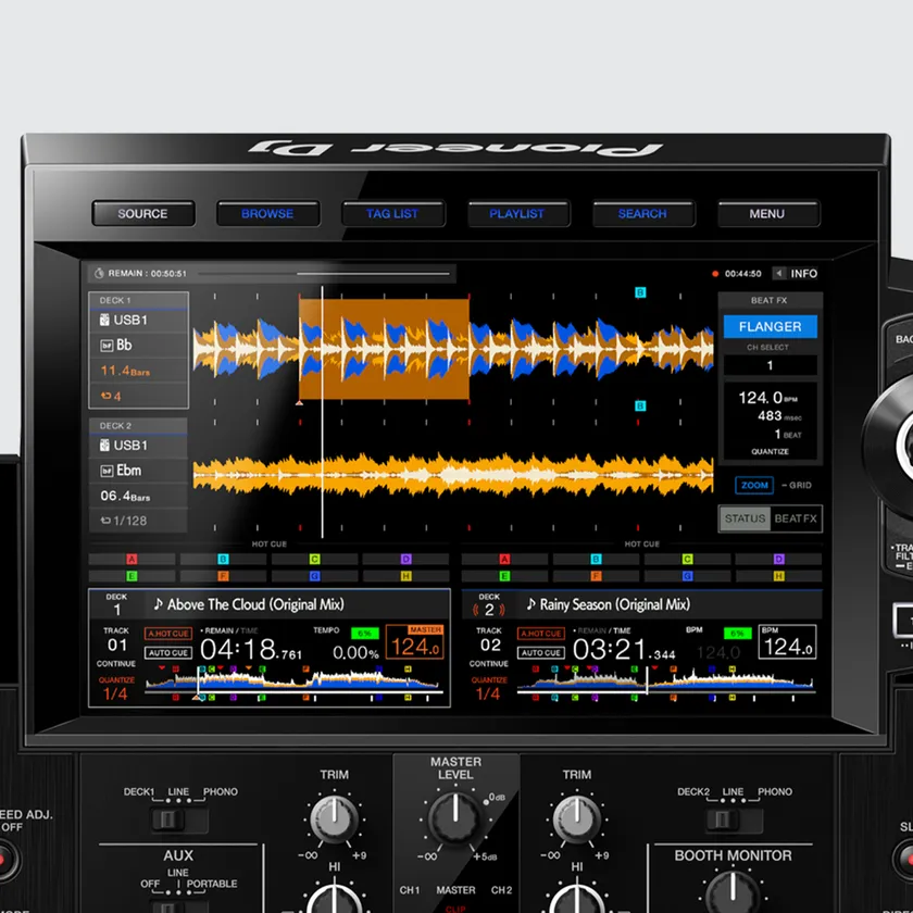 当社のオールインワンDJシステム最大の10.1インチタッチディスプレイを搭載し、既存モデルよりも高い解像度で、楽曲のブラウズやエフェクトの操作がより快適に、よりスムースに行えるようになりました。ブラウズ画面に新たに加えられたPLAYLIST BANKによってプレイリストを瞬時に選択することでより素早い選曲が可能になります。CDJ-3000にも搭載されているTOUCH PREVIEWでは、ブラウズ画面上の波形にタッチするだけでデッキにロードすることなく楽曲を試聴でき、rekordboxによって解析された楽曲はHIGH・MID・LOWの3Band波形で表示されるので、楽曲の構成を簡単に把握することができます。また、ディスプレイ上でPERFORMANCE PADSにアサインされている機能を確認できるPAD STATUS表示や、エフェクトを操作できるBEAT FXやX-PADなど、快適で直感的なDJプレイを可能にする新機能も加えられました。