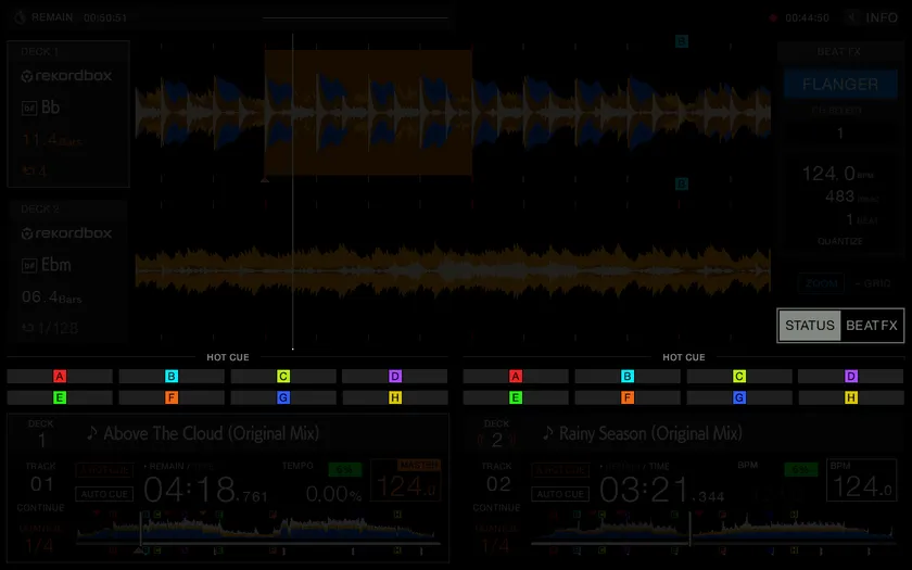 rekordboxでは、INTROやCHORUS、BRIDGEといった楽曲の構成を解析し、それぞれの構成部分を区分けして表示するフレーズ解析を行うことができます。XDJ-RX3では、楽曲の全体波形にrekordboxが解析したフレーズ情報を表示します。楽曲全体の展開を視覚的に確認し、適切なミックスポイントが把握できるので、より精度の高いミックスが可能になります。