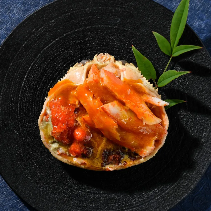 日本海でとれたせいこ蟹を塩茹でした後、せいこ蟹の身や蟹みそ、内子、外子を丁寧に取り出し丸々1ハイ分を羅盛りにしました。別添えのたれ雲丹とからめてお召上がりいただきます。汐うにの芳醇な磯の香りを纏い、せいこ蟹の甘味と卵のプチプチとした食感は日本酒のお供におすすめです。