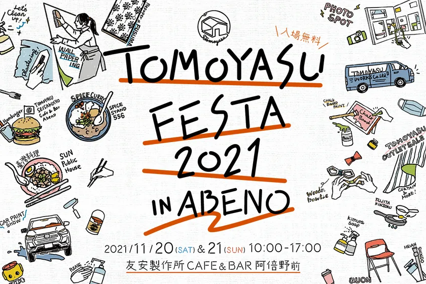 インテリア・エクステリア・DIY商材を販売する株式会社友安製作所(本社:大阪府八尾市、代表取締役社長:友安 啓則、以後「当社」)は、2021年11月20日(土)・21日(日)の2日間、大阪市阿倍野区にある「友安製作所Cafe&Bar阿倍野」前にて、『TOMOYASU FESTA 2021(トモヤスフェスタ2021)』を開催いたします。本イベントでは、インテリア雑貨や生活用品などの、くらしを彩るアイテムの販売をはじめ、ミニDIY体験ができるワークショップ、プロによる実演、イベント限定のフード等々、様々なコンテンツをお楽しみいただけます。