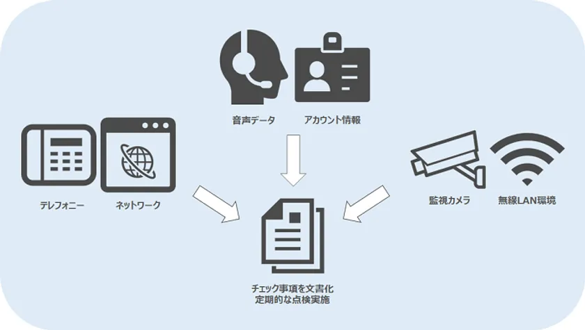 そこでビーウィズは、コンタクトセンター運営にあたり、従前からのセキュリティ対策に加え、以下のようなセキュリティ事項を文書化した上で、定期的な点検を行い、証跡を残し続けることで、クレジットカード情報保護に特化したPCI DSSに準拠認定されました。
