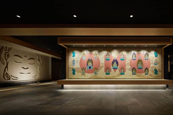 ホテル入口を入ると目の前に、21尊の仏像により構成される東寺の立体曼荼羅(まんだら)をテーマにした「まんだらアート」と、優しくほほえむ仏さまの表情や柔らかさを淡い光と影を使って表現した「ほほえみウォール」の2つのアートワークが宿泊者を出迎えるように設えられています。
