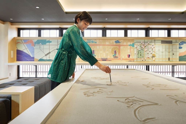 OMOベースの中心にあるのは、写経や書を通して心をととのえる写経テーブルです。弘法大師空海が書の達人であることから着想しました。墨を使う書とは異なり、棒で砂に書き、終えた後は砂を消すのみのため、気軽に誰でも参加でき、失敗をおそれずに心ゆくまで何度でもチャレンジできます。
