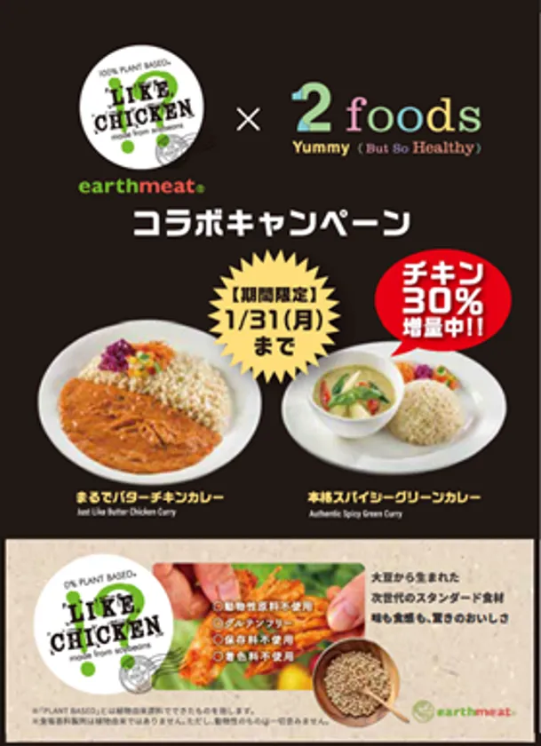 FOOD TECH PARKに併設する株式会社TWOが手掛ける、“ヘルシージャンクフード” をコンセプトとしたプラントベースフード(植物由来原料)カフェ「2foods(トゥーフーズ)」にてearthmeat LIKE CHICKEN!?を採用しているメニューの期間限定30%増量キャンペーンを行います。