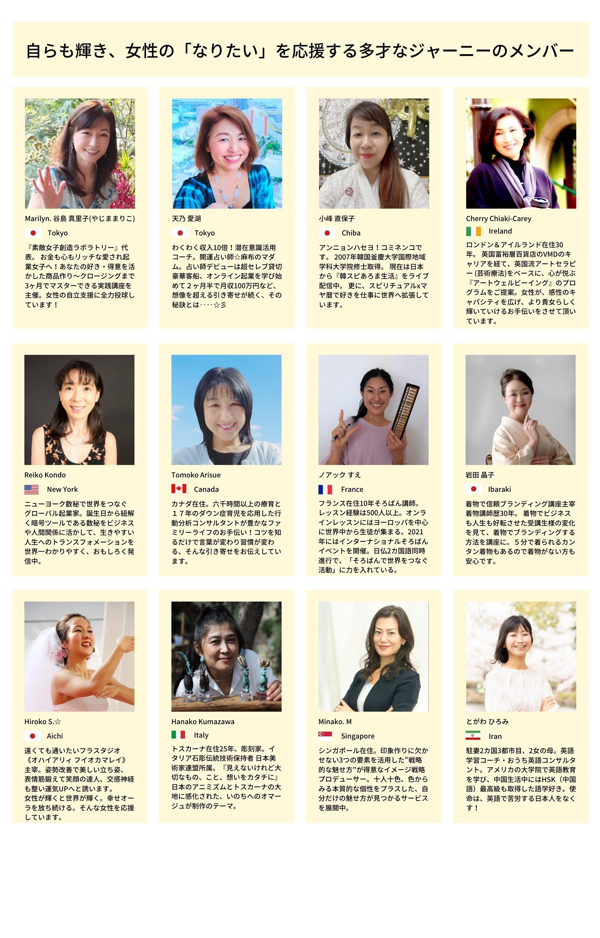 私たちは自分らしく生きていきたい女性が世界中から集まり、発信力を高め、互いを応援しあうことで自己実現を目指しています。