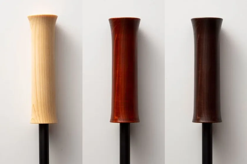 グリップ部には、東濃ヒノキを使用。木目が際立つシンプルなウレタン塗装、時間が経つにつれて味が増す天然塗料の漆/赤漆を用意しました。
