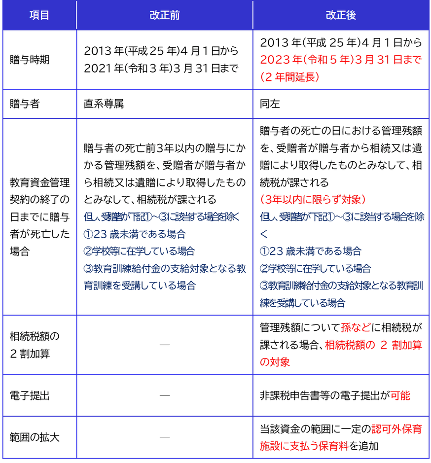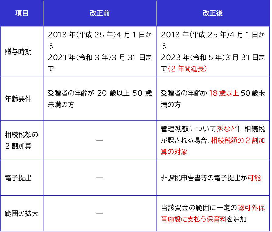 当該措置は、贈与を受ける人一人当たり1,500万円まで(学校等以外の者に支払われる金銭については 500 万円まで)の教育資金が非課税になる制度ですが、改正概要と適用時期は以下のとおりです。