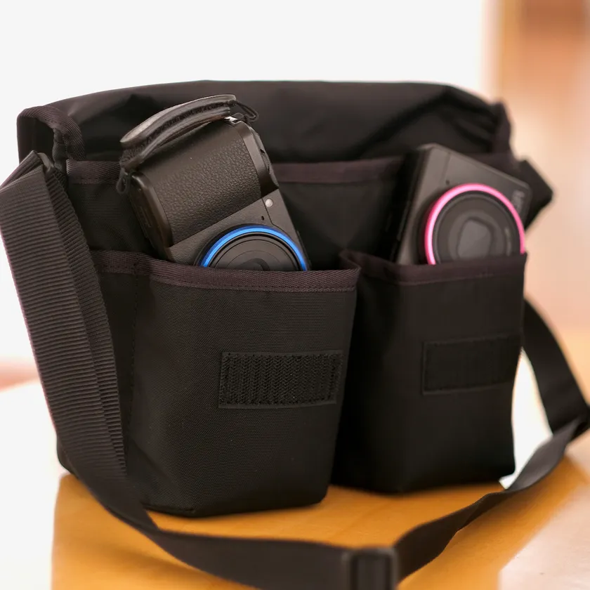 GRIII、GRIIIx(または他コンパクトカメラ)を縦に収納でき2台のカメラを使いながらの撮影時に威力を発します。フラップを裏側に回せばカメラにすぐアクセスでき瞬間を逃しません。
