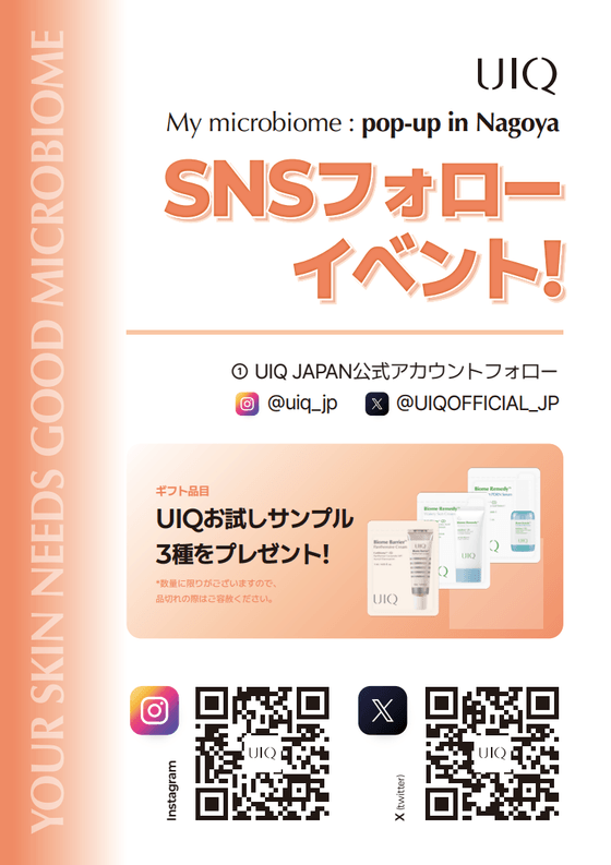 イベント来場者限定キャンペーンとして公式SNSをフォローいただいた方にUIQの定番アイテムをお試しいただけるサンプル3種類セットをプレゼントいたします。当日、UIQブースへご来場のうえ、UIQ公式InstagramおよびX(旧Twitter)をフォローしていただいた方を対象に、その場でサンプルをお渡しいたします。ブランドを代表するスキンケアアイテムを実際にお試しいただける貴重な機会となっております。