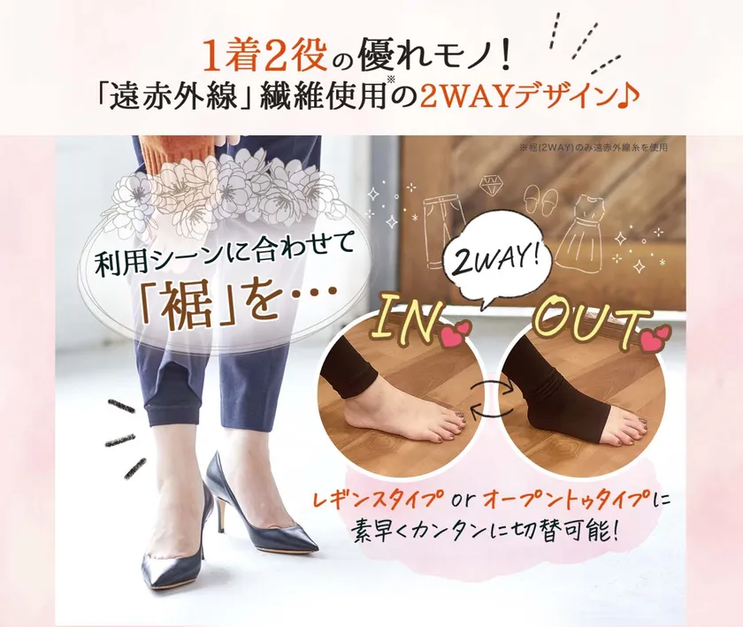 裾の長さを自由に切り替え可能な“二重構造”の2WAYデザイン。裾を伸ばせば足の甲から裏まで「360°」カバーできる【オープントゥタイプ】に。裾を折り込めば【レギンスタイプ】に特急変身!