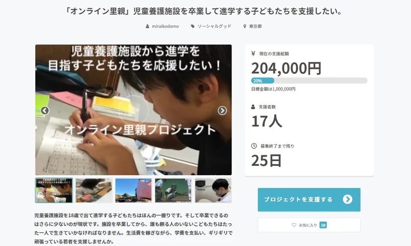 一般財団法人みらいこども財団(所在地:大阪市中央区、代表理事:谷山昌栄)では、親や親戚からの後ろ盾がなく、経済的にも精神的にも頼る大人がいない中で進学した児童養護施設の子どもたちが、卒業まで安心して勉学に励んだり、充実した学生生活を送ることができるように、金銭面・精神面の両方をサポートし、温かく見守る“オンライン里親”プロジェクトを開始。学費支援の補填とプロジェクトの拡大を目指し、クラウドファンディングサービス「GoodMorning」にて、『「オンライン里親」児童養護施設を卒業して進学する子どもたちを支援したい。』を公開しました。2021年11月より12月5日まで学費1年分にあたる100万円を目標に支援を募ります。