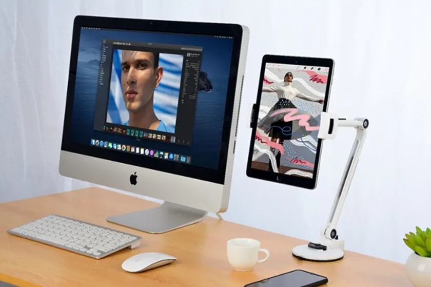 【タブレットアームスタンドS2C】は自由な角度で固定する事が出来、パソコンのモニターの横にサブPCのようにタブレットを設置することが可能です。