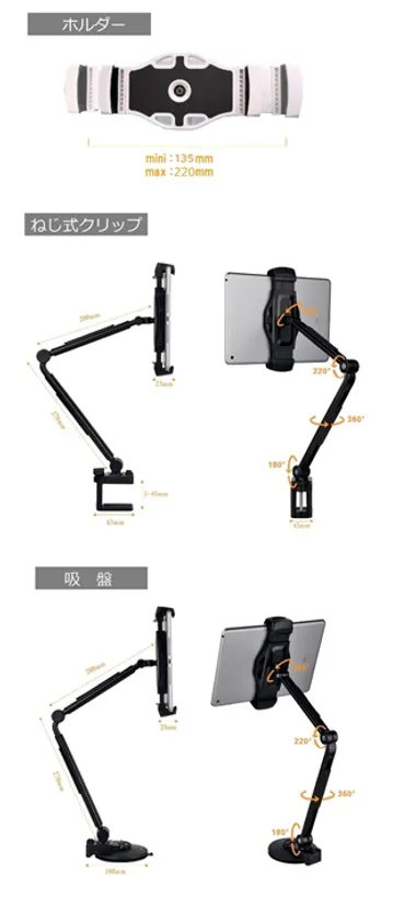 【タブレットアームスタンドS2C】は6箇所の軸をもち、各部にロック機構を備えたアルミ合金製のタブレットアームです。