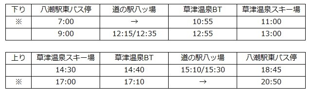 ※12月24日(金)~3月31日(木)までの期間は、八潮駅9時発の通常便に加え、日帰りスキーも可能な八潮駅7時発のスノーライナーを増便運行いたします。
