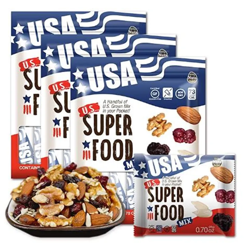 *本製品は、アメリカ発祥の「スーパーフード(特に栄養素が多い食品)」をもとに、アメリカ原産の素材を厳選して作った、ナッツ&ドライフルーツ小袋ミックス品です。1袋でバランスよく栄養補給ができる、健康にいい間食としてオススメしております。