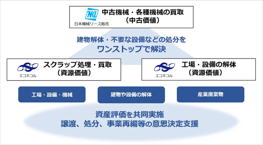 今般の取組みでは、エコネコルが長年培ったスクラップ処理・解体のノウハウと、NKLの機械設備の査定・売買機能などモノに対する知見を活用し、固定資産の評価から不要となった機械等の再販、資源化まで一貫したサービスをご提供します。