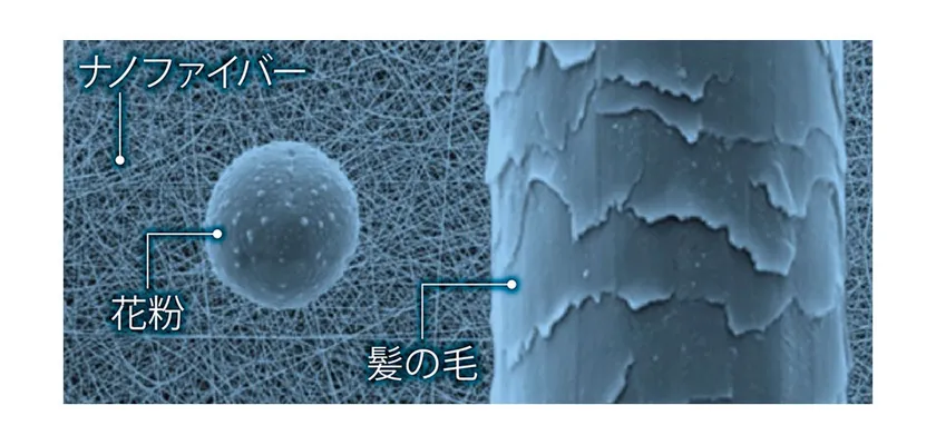 ナノファイバーマスクは、信州大学(※1)と、ナノファイバー技術では世界最高水準の韓国TOPTEC社が共同開発。『ナノエール』はナノファイバー(髪の毛の200分の1程度の細さ)という超極細繊維を採用した高性能マスクです。今まで最高水準の捕集性能を持つメルトブローン(極細繊維)より細かく、その性能は世界の防塵マスク規格(※2)に合格する水準です。