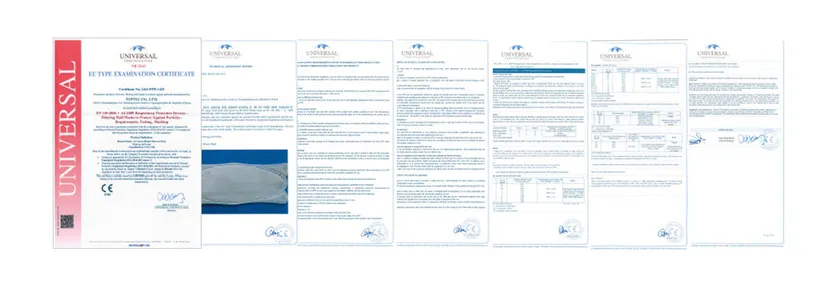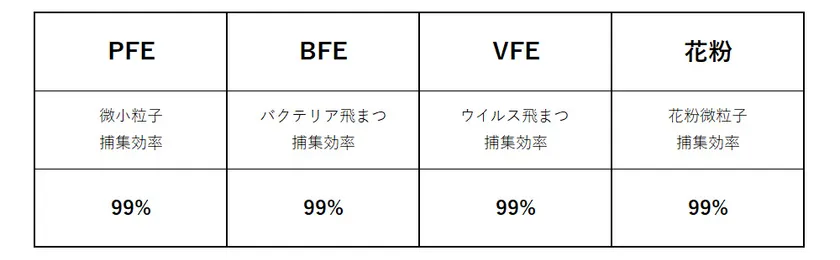 国内の第三者機関(一般財団法人カケンテストセンター)で、微小粒子捕集効率(PFE)99%、バクテリア飛まつ捕集効率(BFE)99%、ウイルス飛まつ捕集効率(VFE)99%、花粉微粒子捕集効率99%であることが実証されています。
