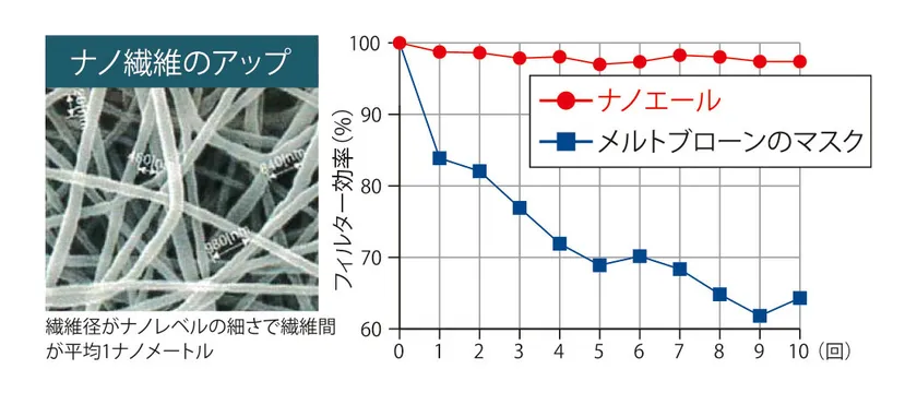 『ナノエール』のフィルターは、静電気で集塵するのではなく、繊維自体で集塵するので、75%エタノール消毒液スプレーを10回使っても、性能はほとんど低下しません。(信州大学調べ)