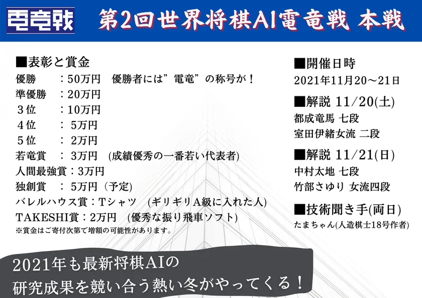 本イベントは学術的な意味だけなく、11月20日(土)解説に「都成竜馬七段&室田伊緒女流二段」、11月21日(日)解説に「中村太地七段&竹部さゆり女流四段」、AI技術聞き手「たまちゃん(人造棋士18号作者)」を配する構成です。将棋ファンや将棋電脳ファンにも興味深い構成で、幅広くAI技術の発展を社会に啓蒙できるものと考えています。