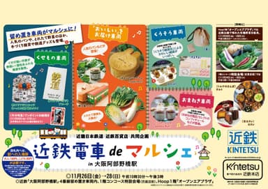 近畿日本鉄道株式会社(以下「近鉄」)と株式会社近鉄百貨店(以下「近鉄百貨店」)は、11月26日(金)から28日(日)の間、大阪阿部野橋駅で停車する「あすか万葉」トレインの車内と駅コンコースおよびHoopの1階「オープンエアプラザ」で、「近鉄電車 de マルシェ in 大阪阿部野橋駅」を開催します。