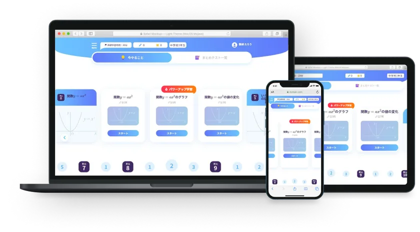 スタギア数検は、数検の公式オンライン学習サービスで、中学校1~3年生の現行の学習指導要領の内容・領域に対応しており、検定合格に向けた学習はもちろん、日々の学習にも幅広くご利用になれます。また、パソコン、スマートフォン、タブレットなど幅広いデバイスに対応しているので、隙間時間などを利用してどこでも学習することが可能です。