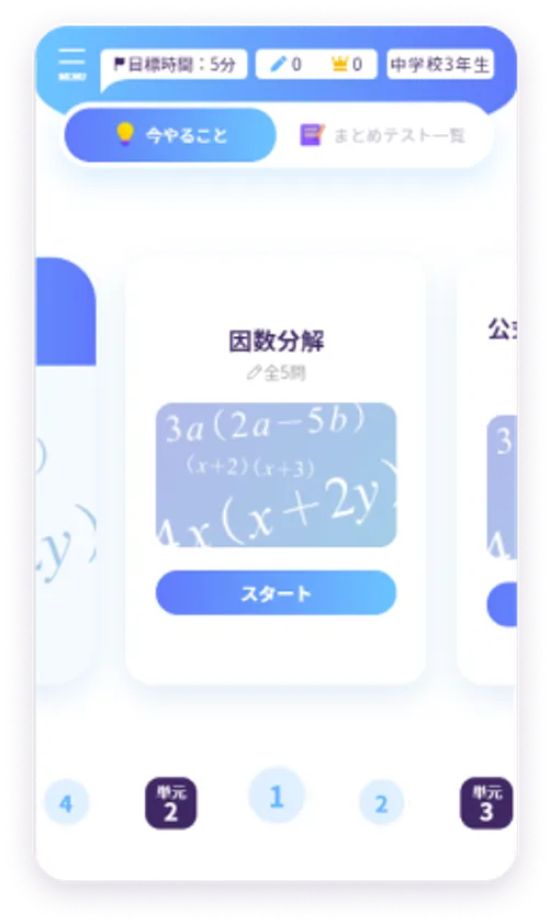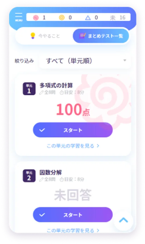 学習内容が定着しているかを単元ごとの「まとめテスト」で確認することができます。何度でもチャレンジでき、しっかりと復習を重ねることで学力の定着を促します。