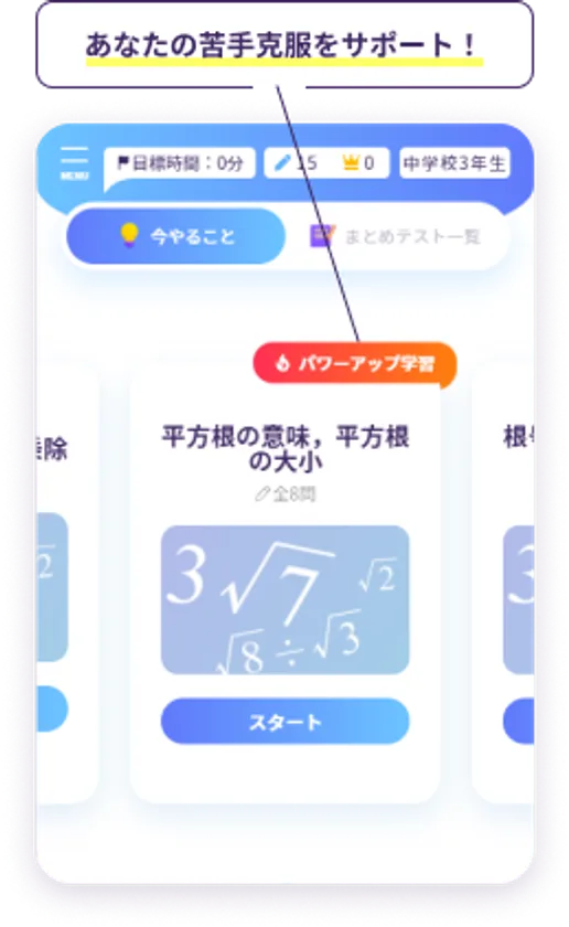 これまでに学習した範囲や前の学年(中学生の学習範囲内)に戻り、基礎的な内容を再度学習することができる戻り学習機能「パワーアップ学習」が、苦手な単元を克服するための学習をサポートします。