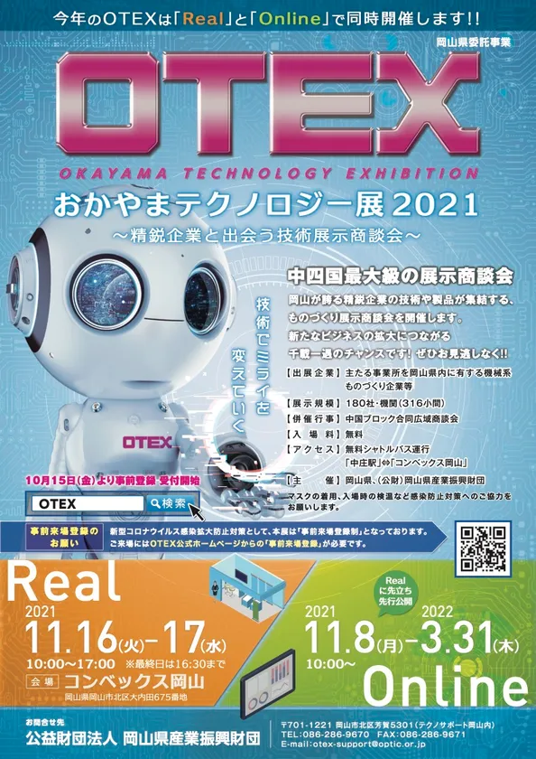 『おかやまテクノロジー展(OTEX)』は、機械系ものづくり企業の展示商談会としては中四国最大級で、「ものづくり県おかやま」を広くアピールするため、2016年から開催しています。