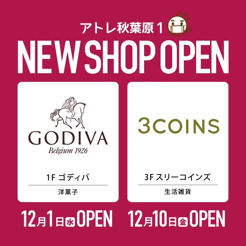 株式会社アトレ(本社:東京都渋谷区、代表取締役社長:一ノ瀬 俊郎)が運営するアトレ秋葉原1(所在地:東京都千代田区)では、2021年12月に「ゴディバ(洋菓子)」・「3COINS(生活雑貨)」が新たにオープンいたします。