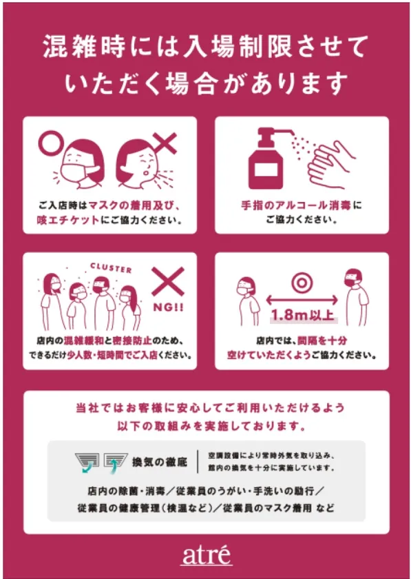 アトレでは、お客様ならびに従業員の健康と安全に配慮し、新型コロナウイルス感染防止対策として以下の取組みを実施しております。