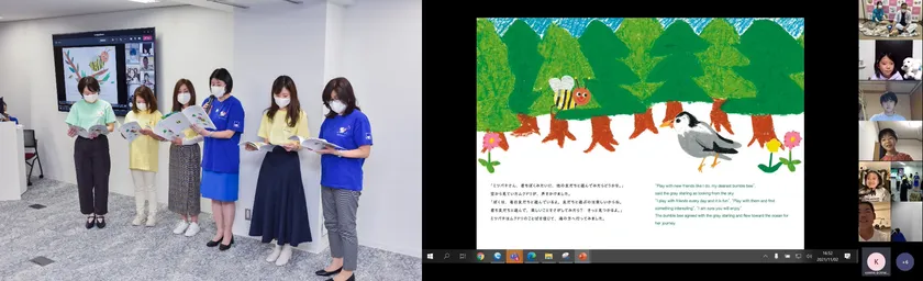 絵本を制作した子どもたち5人と、アクサダイレクトの社員をオンラインで結び、一緒に絵本を朗読 ※子どもたちは各自の自宅からリモートで参加