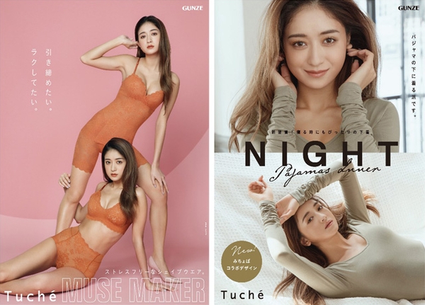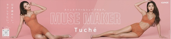 「Tuché」は女性のライフスタイルの変化や多様化するニーズを捉えながら、デザイン性、機能性を高めて進化 してきました。2021年秋冬シーズンでは、外出自粛や在宅ワークの増加を受けて、コロナ太りによる補整下着のニーズに着目。ストレスフリーの着心地と身体のラインをキレイに整えるボディメイクを実現したシェイプウェア「MUSE MAKER」を発売します。新ビジュアルでは、みちょぱさん二人が重なり合うようにポージングをとり、美ボディラインを披露しています。