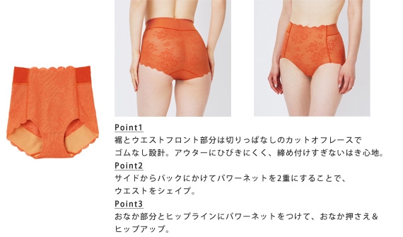 カップ付きキャミソールはウエスト部分のシェイプを強めに設計、ショーツとロングガードルもウエスト部分のパワー