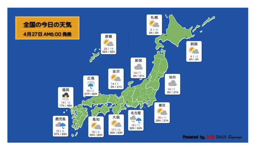 デジタルサイネージに配信するコンテンツの1つとして、最新の天気予報を表示する機能です。DAiS Signageの利用プランをご契約いただいたお客様であれば、標準サービスとしてご利用いただけます。