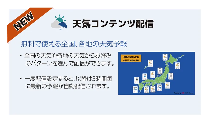 そのようなご要望から、このたび、「天気コンテンツ配信」機能を追加費用無しでご提供することといたしました。今後も標準サービスの充実を図り、デジタルサイネージの導入や配信管理に対するハードルを下げ、お客様満足度の向上を目指してまいります。