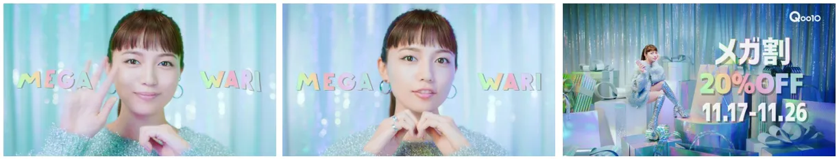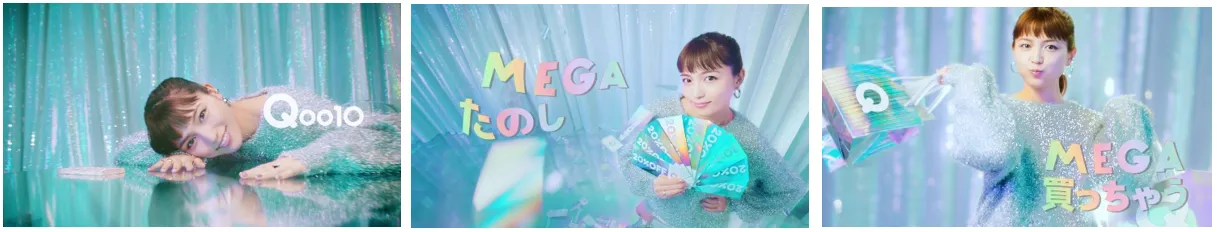 Qoo10は、女優・川口春奈さんをイメージキャラクターに起用し、プロモーションを展開しています。今回のTVCMでは、ラメ入りのニットにキラキラのロングブーツを合わせたファッションと、洗練された白色のトップスとパンツを合わせたクールなOL風ファッションという、対照的な衣装を着こなしています。キュートな「メガ割ダンス」や、川口さんの印象的な目元がドアップになるカットにもご注目ください。