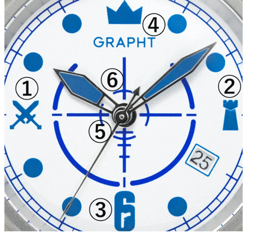 6SIEGEの世界観を踏襲し、日常生活で大好きなゲームのモチーフを身に付け、そのデザイン性と機械式時計の安定した精度を両立させることを目指しました。機能性が特徴であるミリタリーウォッチを、6SIEGEをイメージした強固でスタイリッシュなギアアイテムにデザイン。クラウンを4時の位置にずらしたことで回しやすく、手首への負担を軽減。20ATM防水、レンズはサファイアガラスを使用し、高硬度で傷に強い設計です。