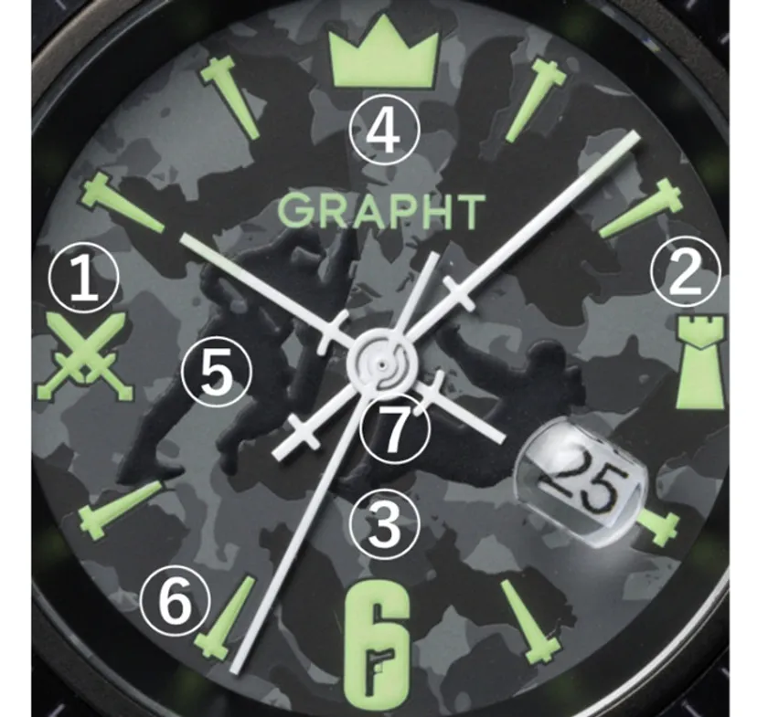 (5) 文字盤のベースは6SIEGEの特徴である「気づかれないように敵を制圧する」戦略と戦術には欠かせない迷彩柄をイメージし、オペレーターの戦闘のシルエットをその迷彩柄に凸形状にレリーフ