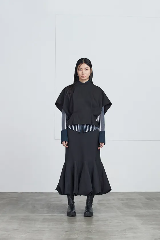 生地に厚みと張り感があり、立体感のあるモードなフォルムをイメージしました。