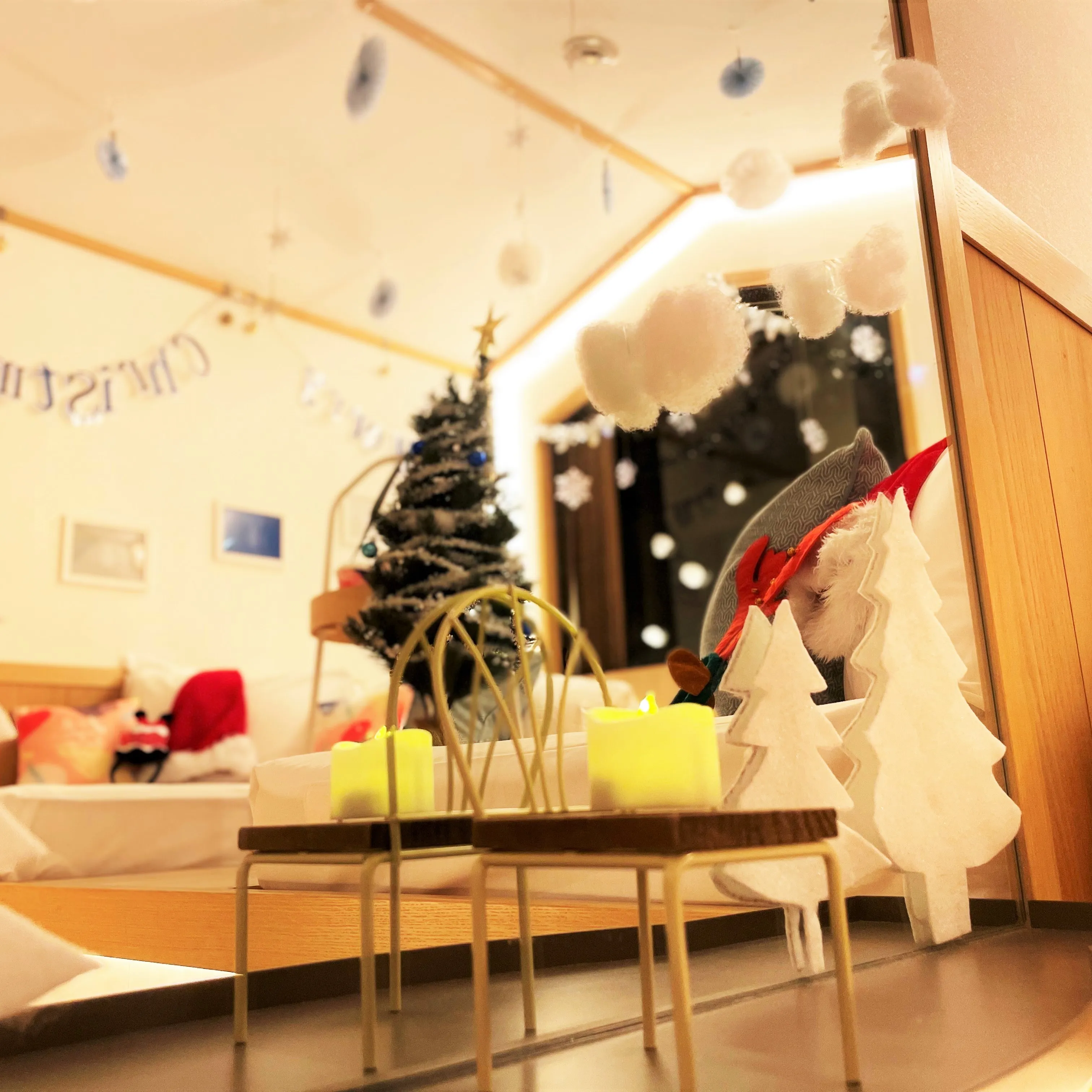 扉を開けると、白とシルバーで飾り付けられたクリスマスツリーがあなたをお出迎え。青いオーナメントがきらりと光ります。お部屋にある大きな鏡は、雪が降る街をイメージしました。窓や天井にも雪の結晶がたくさん。お部屋の中にいるのに、まるで雪が降っているみたい。お部屋のLEDライトをつければ、クリスマスのアートが照らされます。幻想的な雰囲気を味わうことができますよ。