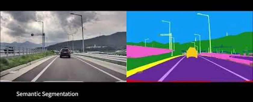 セマンティックセグメンテーション:車両のカメラで取得した画像を、ディープラーニング技術によりピクセル単位で解析し、対象物を分類します。